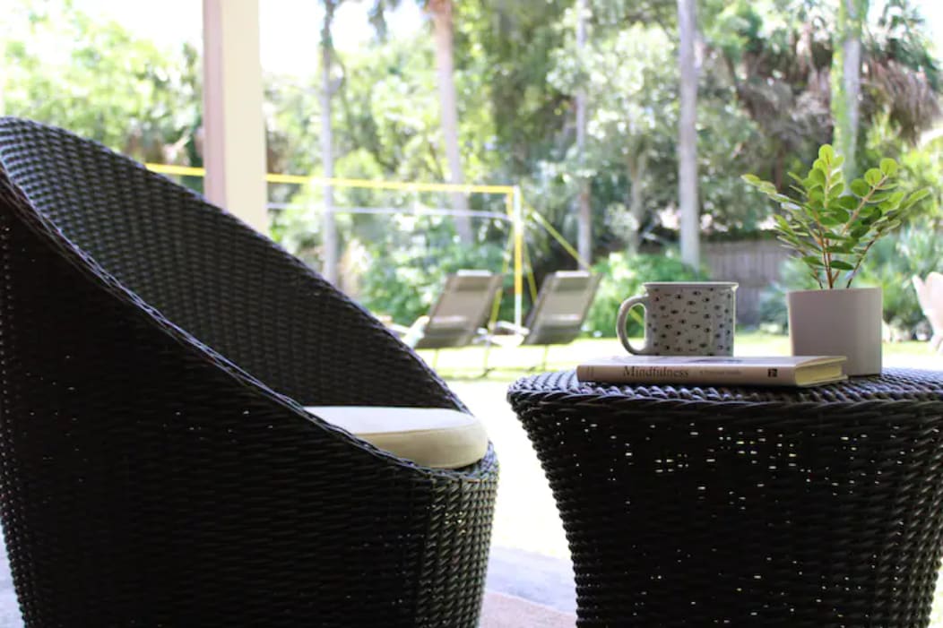 Volleyball/badminton net and comfortable rocking lounge chair for sun bathing, reading or just chilling. (along fam of 3 Seahawks who live in trees)